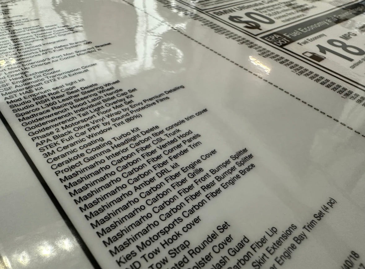 Crafted to resemble the original BMW Monroney layout while giving you complete freedom to include aftermarket parts, tune details, and personal touches.
