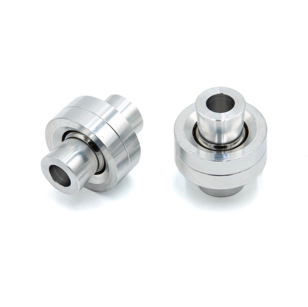 These Rear Lower Control Arm Knuckle Bushing replace the rubber factory bushing attaching the lower control arm to the knuckle with a low friction teflon-lined spherical bearing. Replacing the OEM component with this bushing will allow for less deflection under heavy load, and less bind as the arm travels through its suspension. We use the largest possible FK bearing in this location for increased longevity and lower NVH. The housing for the bearing is machined out of 6061-T6 aluminum and is CNC cut to +/- .001" tolerance to insure proper fitment.