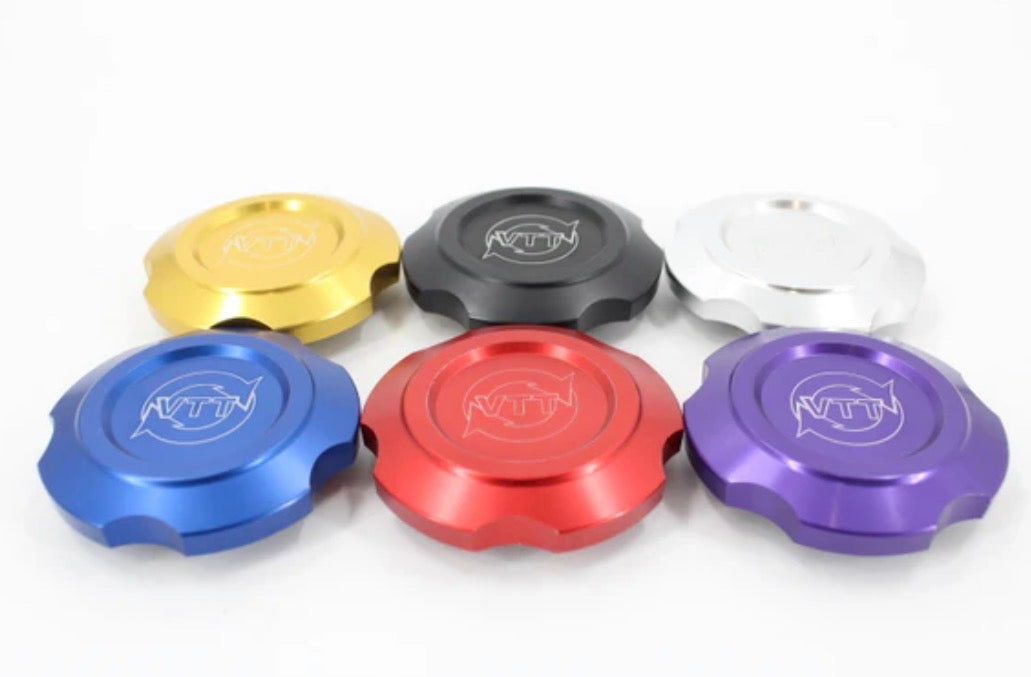VTT Billet CNC oil caps add a nice touch of quality to an otherwise plastic-filled BMW engine bay. We offer these in red, black, blue Purple, gold, and clear anodizing. Made from 6061-T6 aircraft aluminum with stainless steel locking tabs.