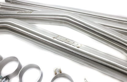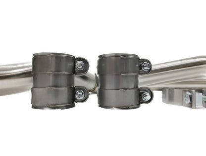 The ARM N63 Midpipes come in two main sections, the front section and the rear section. The front section connects to the downpipes which utilize the slip-fit style connection. To secure the front section even further, it is also held in place by two brackets which mount to the original N63 midpipes mounting points.
