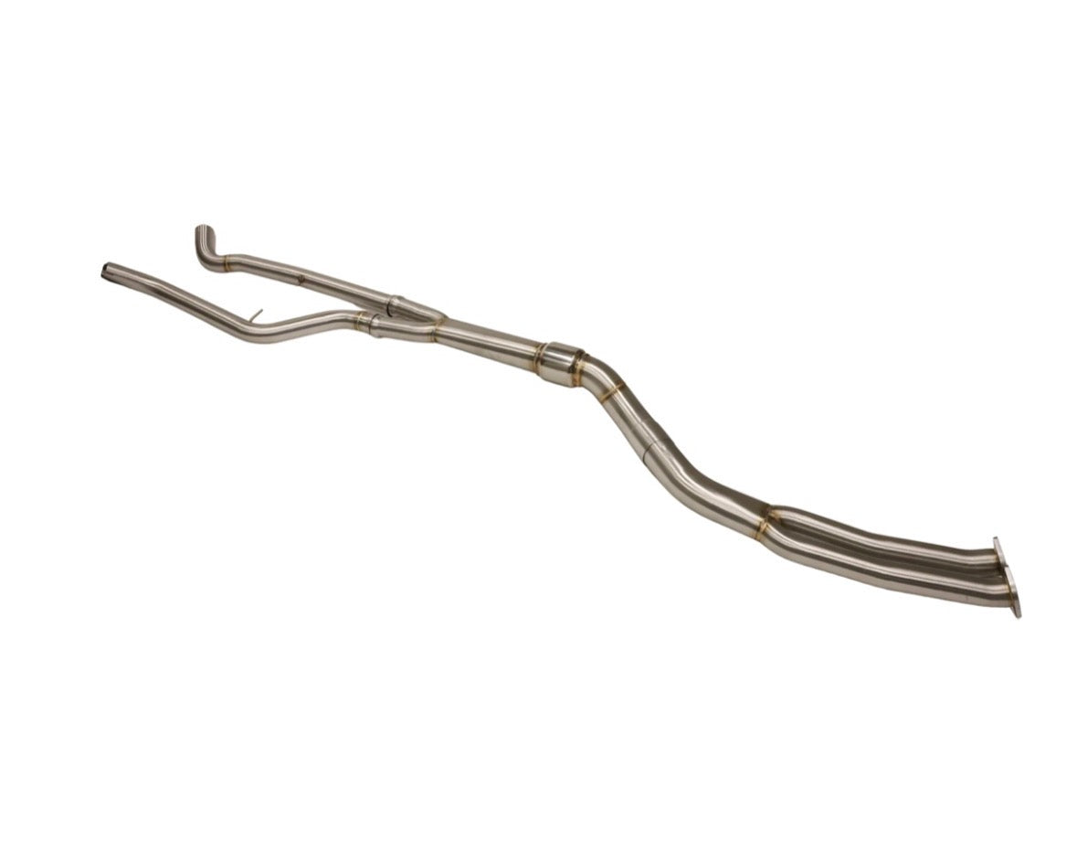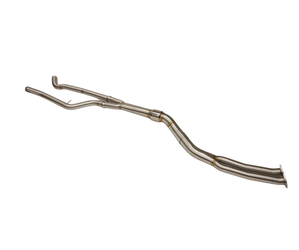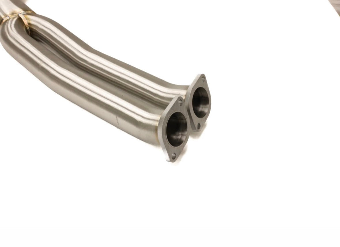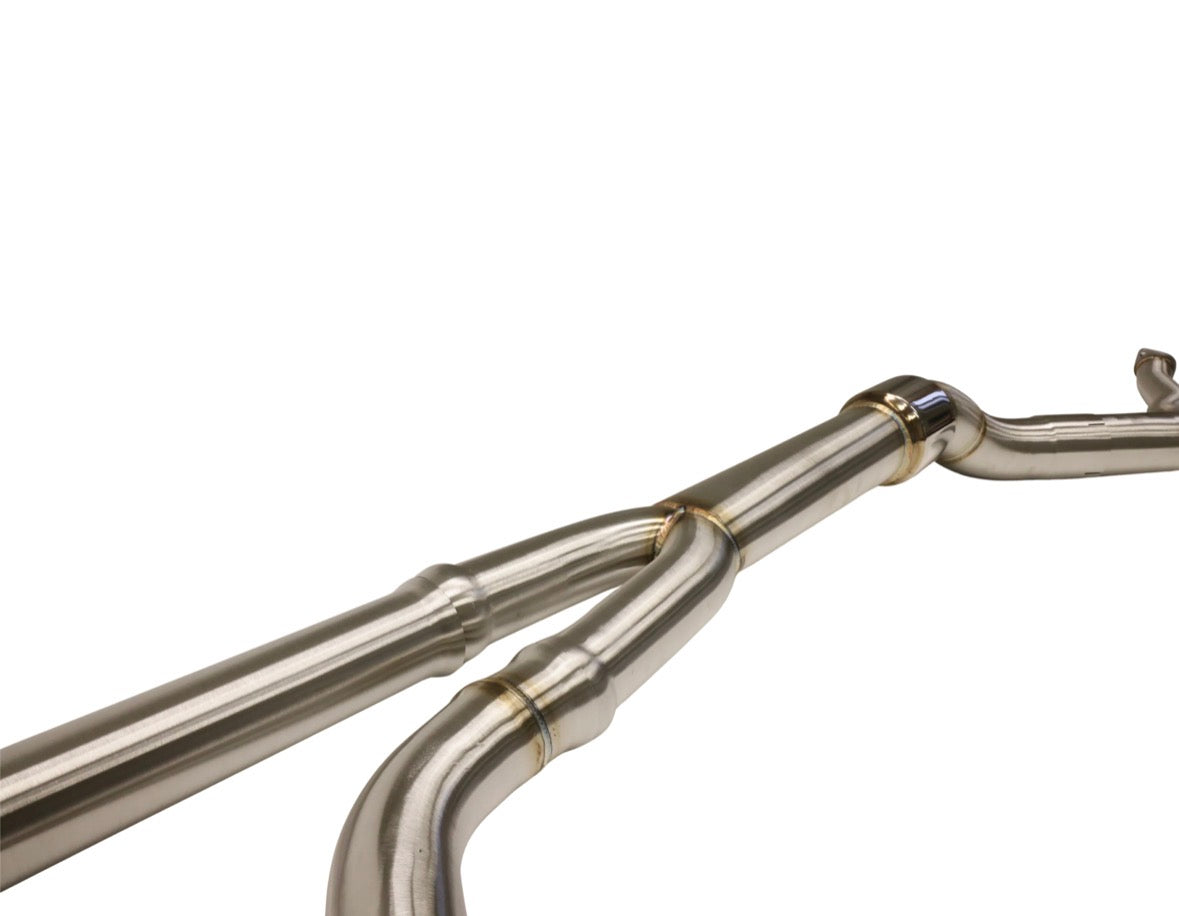 Towards the rear section of the ARM 335i 3.5" Midpipe splits back to a dual design to connect with the OEM axle-back exhaust section. By retaining the factory dual outlet layout at the rear, the ARM midpipe preserves full compatibility with the OEM axle-back and its integrated exhaust valve system. This ensures proper exhaust flow distribution, correct valve operation, and OEM-level fitment, while maintaining the performance and sound benefits of the single 3.5" midpipe design throughout the center section.