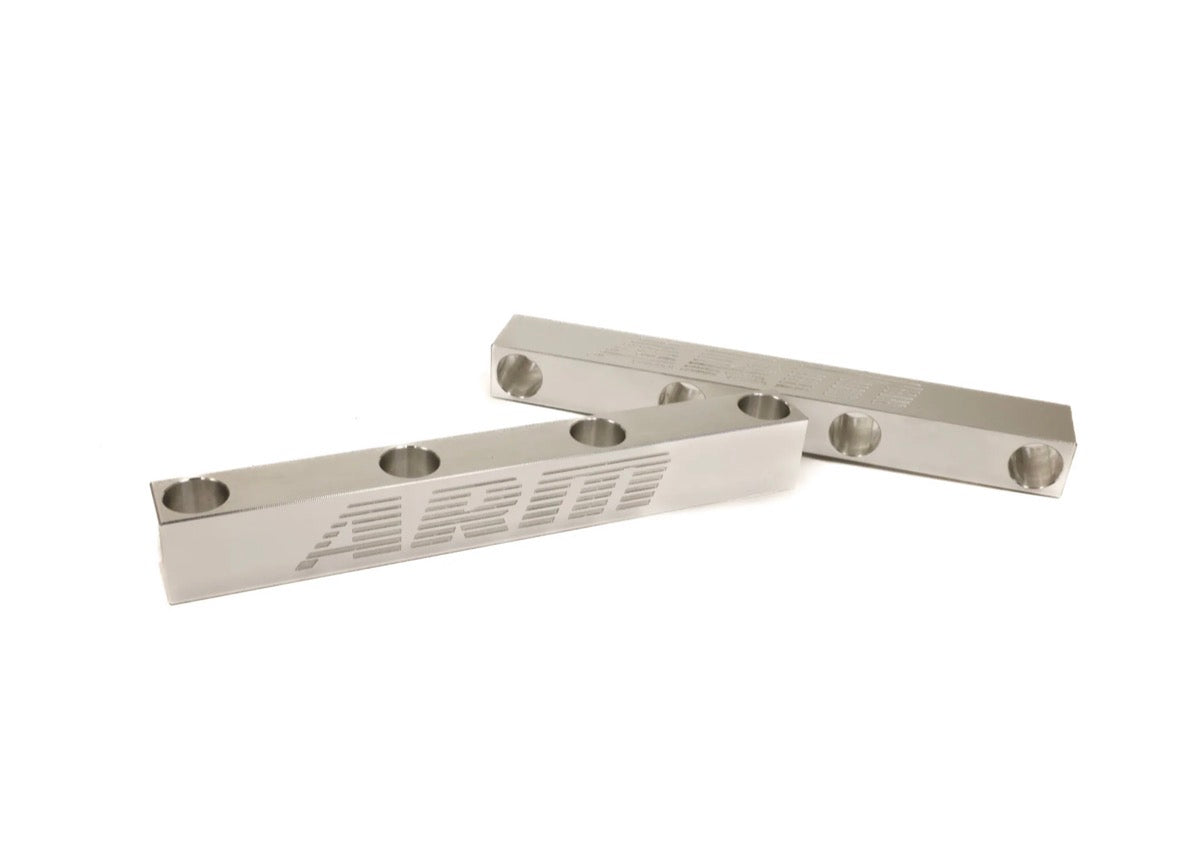 To allow for clearance of the OEM chassis brace, the ARM 335i 3.5" Resonated Midpipe includes two precision machined aluminum chassis brace spacers which allow extra space for the larger 3.5" ARM Midpipe to pass through to the axle-back section. This solution allows the larger midpipe to pass through without contact or vibration while retaining the factory chassis brace and its structural function. The spacers are designed specifically for correct fitment and alignment, ensuring a clean installation without cutting, bending, or permanent modification to the vehicle.
