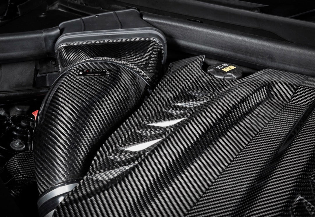 The Eventuri X5M intake system consists of a number of components engineered to perform a specific purpose and fabricated to the highest of standards. We use 100% pre-preg carbon fiber with no fibreglass which means we can achieve a smooth internal surface to maintain smoother airflow. Here are the details for each component and the design ethos behind them: