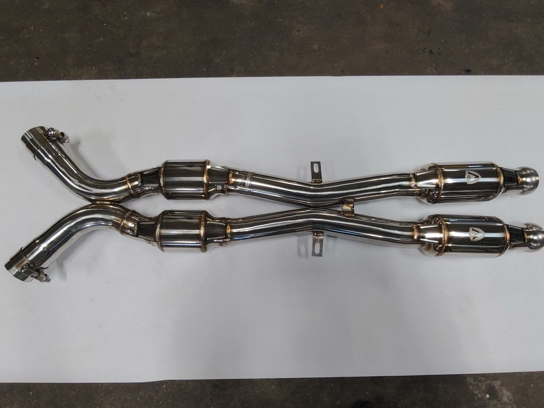 Welcome to the Valvetronic Designs E9x M3 midpipe. This midpipe is quite different than most, featuring a freeflow x merge right after the transmission tunnel. This design helps allow for maximum exhaust scavenging and power gains throughout the rev range. At the rear of the midpipe we have two 12-inch resonators to smooth the exhaust sound and provide noise mitigation. We also offer a catted version of the X-pipe for those who do not want to go fully catless. This X pipe is designed for those who want maximum sound and maximum Horsepower gains, it is not for the weak of heart.