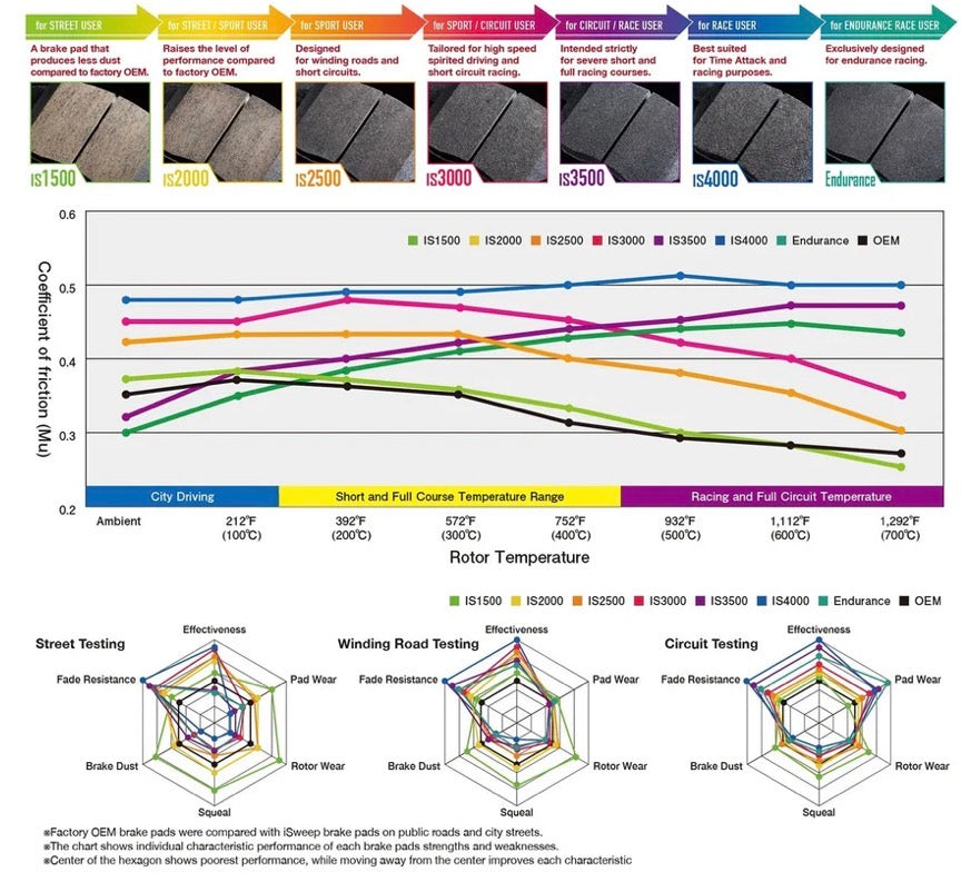IS1500 is ideal for everyday use, offering significantly reduced brake dust and noise compared to OEM pads. With improved initial bite and braking control by 10-20%, IS1500 pads provide smooth, reliable braking under normal city conditions. Tested in extreme environments, these pads ensure consistent and quiet operation, making them a low-maintenance choice without compromising performance. IS2000, designed for spirited driving, offers sharper braking response, precise control, and excellent fade resistance—perfect for aggressive driving and dynamic road conditions.